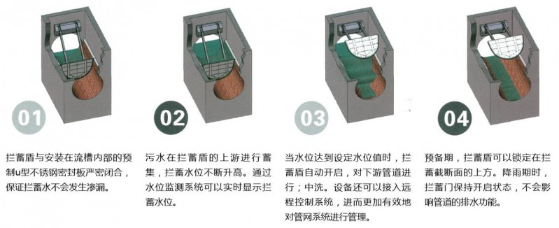 闲置期间,拦蓄门可以锁定在拦蓄截断面的上方,不占用管道任何排水空间。雨季时,拦蓄门保持开启状态,不会影响管道的排水功能。断电时,亦可保持开启状态。